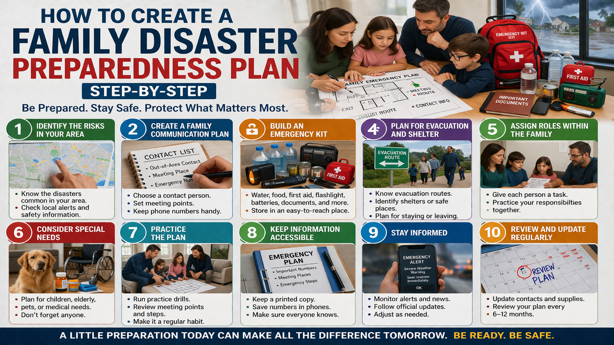 Creating a family disaster preparedness plan is one of the most practical steps you can take to protect your household. It doesn’t require special training — just a bit of planning, communication, and awareness.